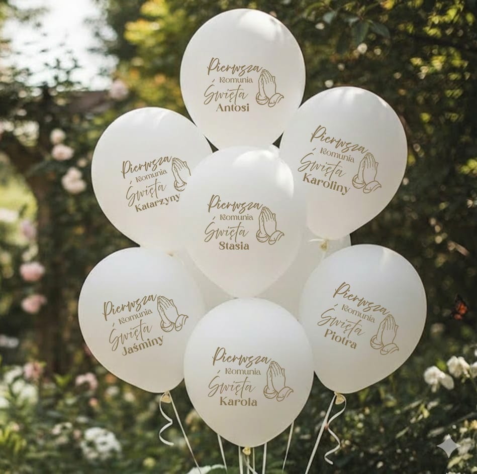 Dodaj blasku Pierwszej Komunii Świętej dzięki balonom z imieniem Twojego dziecka. Zestaw 100 sztuk białych spersonalizowanych balonów z złotym nadrukiem na jednej stronie, to profesjonalne rozwiązanie dekoracyjne dla rodziców, restauracji i agencji eventowych. Polska jakość, ekologiczny lateks i design, który łączy tradycję z nowoczesną estetyką.