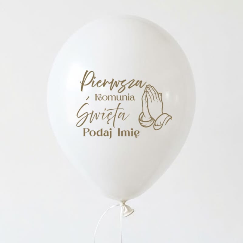 Złoty nadruk jest trwały, odporny na ścieranie i zachowuje intensywność koloru. Biel balonu jest czysta – idealnie komponuje się z komunijnymi dodatkami: obrusami, serwetkami, kwiatami i świecami.